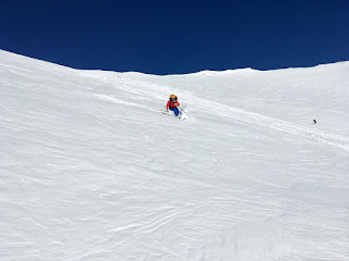 Potem pa najprej nekaj zavojev na drugo (trdo) stran, prečnica v desno in... kar naenkrat zatišje, sneg mehki napihanček, sonce, poezija. Odripava v dolino - mehko, super pela.